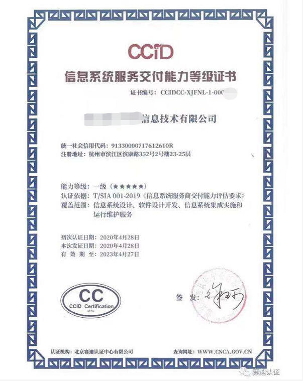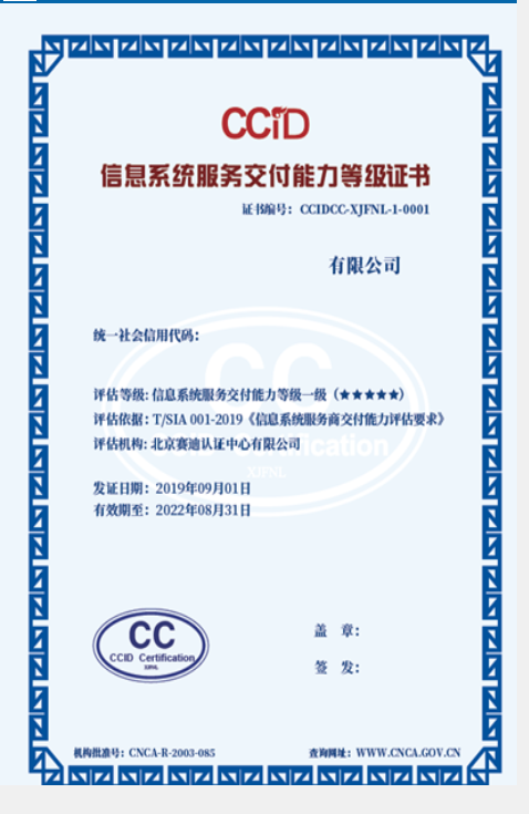 “信息系统服务商交付能力评估”已获得中国国家认证认可监督管理委员会自愿性服务认证备案。